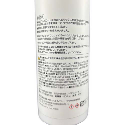 国内ブランド ULGO(ウルゴ)の脱脂剤です。コンパウンドの拭き残しや、コーティング直前の脱脂に使用することでコーティングの密着を高めます。