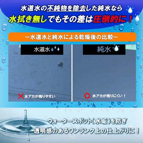 ■【純水は自動車等の洗車や窓拭きにも】カルシウムやマグネシウムなどのイオン成分を含まない純水は、洗車時に利用するほか、窓拭きやバッテリー補充液、ウィンドウォッシャー液、クーラントの補給水にもご使用いただけます。
